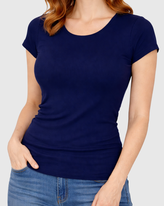 Blusa Básica Feminina Marialícia Manga Curta Canelada Azul Marinho