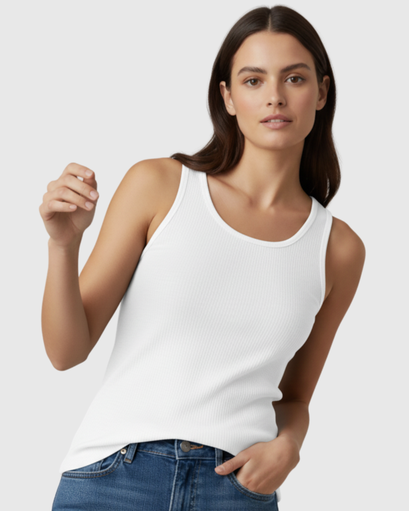 Seu tecido canelado é leve, fresco e possui ótima elasticidade, oferecendo um caimento impecável. A cor branca é um verdadeiro coringa e combina com tudo — perfeita para compor desde looks casuais até produções mais elegantes com sobreposições.