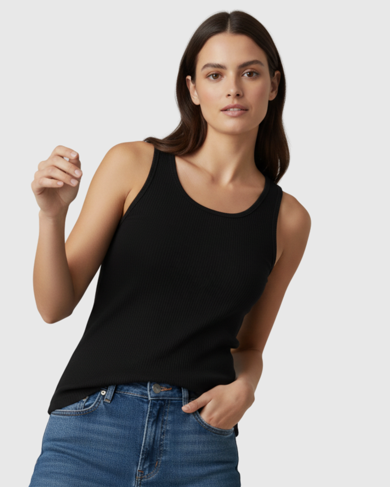 Confeccionada em malha canelada com toque suave, a peça oferece excelente elasticidade e caimento impecável. A cor preta é um clássico que nunca sai de moda, ideal para compor looks casuais ou sofisticados com sobreposições, acessórios e calçados diversos.