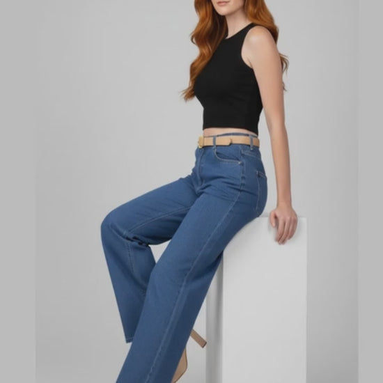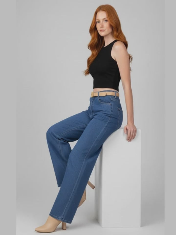 Calça Jeans Wide Leg Oppnus Feminina Cintura Alta com Cinto